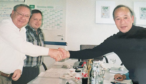 In dieser Zeit wird auch eine Tochterfirma in Japan gegründet, die den Vertrieb in Japan und Asien übernehmen soll. [Bild: Adolf Notter (v.l.), Morimoto senior (v.r.), Manfred Notter (h.l.)]